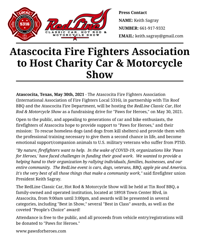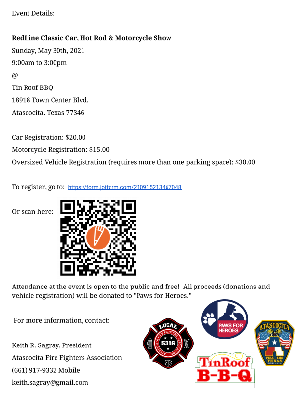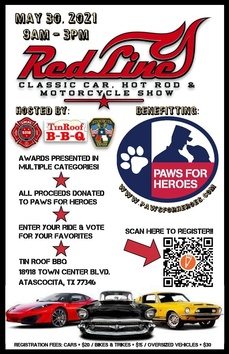 Mark your calendars for May 30th 9am-3pm! Atascocita Fire Fighters Association and Tin Roof BBQ have teamed up to hold a Classic Car, Hot Rod and Motorcycle Show, benefiting Paws for Heroes. Register here https://form.jotform.com/210915213467048