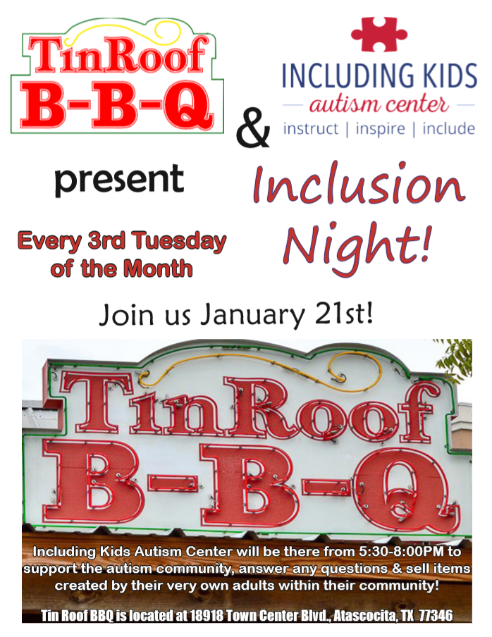Inclusion Night Tuesday, January 21, 2020 5:30 PM 8:00 PM 17:30 20:00 Tin Roof BBQ 18918 Town Center Blvd Humble, TX 77346 USA (map) Google Calendar ICS Third Tuesday of Every Month, Tin Roof BBQ will host an Inclusion Night. Tuesday, January 21st from 5:30PM to 8PM, Tin Roof BBQ and Including Kids Autism Center have partnered to present this event. Tin Roof BBQ supports ALL!